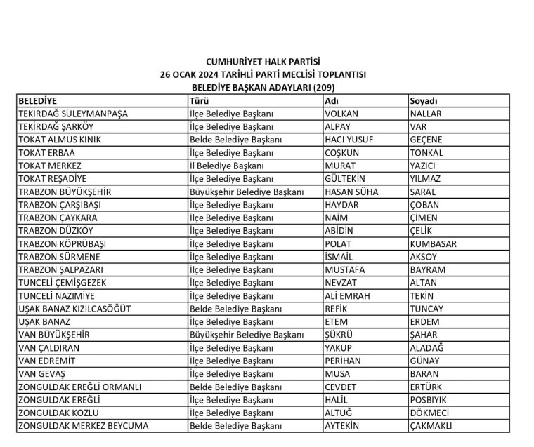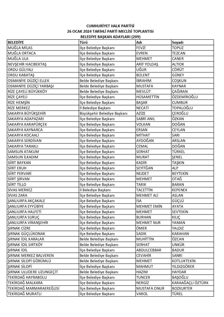 CHP Genel Merkezi’nde yapılan PM toplantısının ardından 31 Mart 2024 seçimlerinde 8 büyükşehir ve 13 il belediyesi, Ankara’nın 11 ve İstanbul’un 14 ilçesi olmak üzere 209 seçim çevresinde daha adaylar belirlendi. İşte CHP'nin listesi;