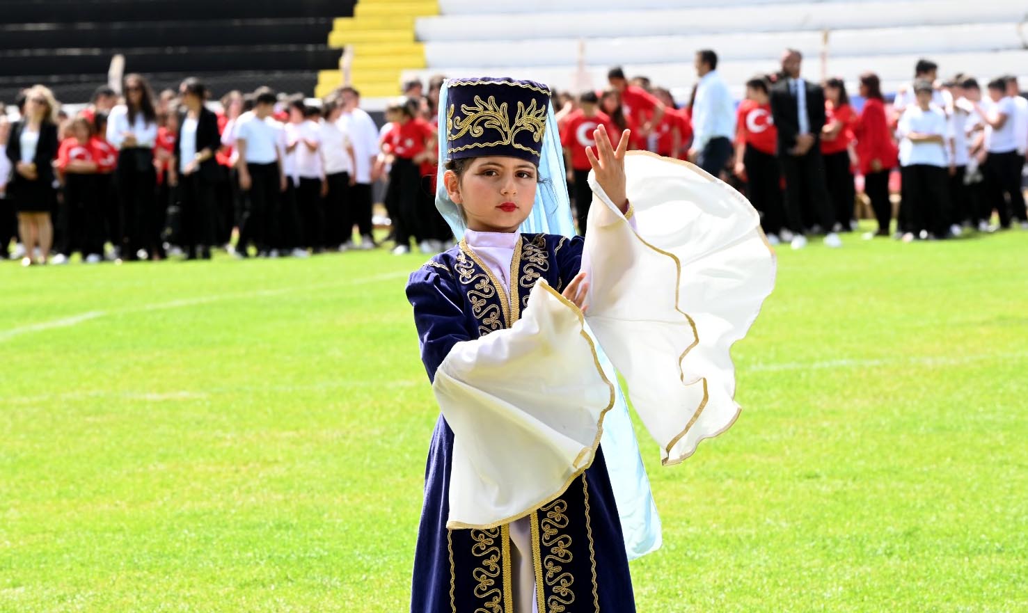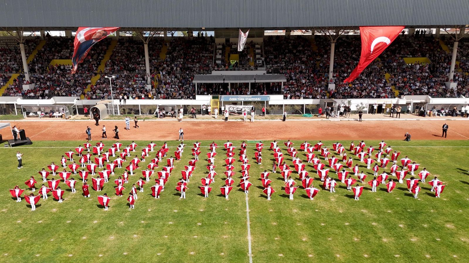 Özer Türk Stadı’ndaki programda, saygı duruşunda bulunulması ve İstiklal Marşı'nın okunmasının ardından Kaymakam İbrahim Keklik ve Başkan Ömer Günel, kent genelindeki okullardan gelerek törene katılan öğrencilerin bayramını kutladı. Öğrenciler ile okulların sergilediği halk oyunları ve çeşitli gösteriler, protokol üyeleri ve stadı dolduranlar tarafından ayakta alkışlandı.