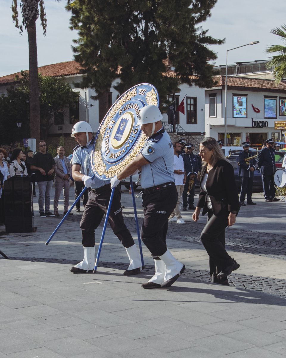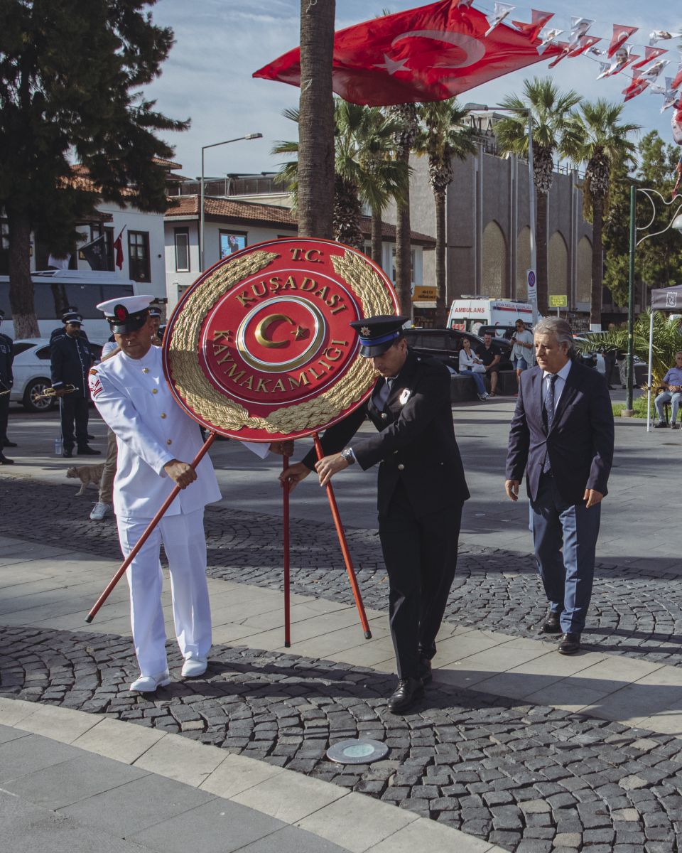 Atatürk Meydanı'nda düzenlenen törene, Kuşadası Kaymakamı İbrahim Keklik, Kuşadası Belediye Başkan Vekili Ayşegül Taşdelen Dağlı, Cumhuriyet Başsavcısı Furkan Öztürk, Garnizon Komutanı Yarbay İlker Görkem, Sahil Güvenlik Bot Komutanı Üst Teğmen Emre Kaçak, Kuşadası Şehit Aileleri ve Gaziler Dayanışma Derneği Temsilcisi Şehrinaz Keskin ve çok sayıda vatandaş katıldı.