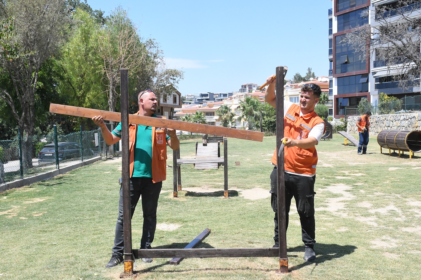 Kuşadası Belediyesi Park ve Bahçeler Müdürlüğü ekipleri, farklı mahallelerde yıl boyunca eş zamanlı olarak bakım onarım ve yenileme çalışmaları yürütüyor. Çocuk parklarındaki kent mobilyaları, oyun grupları ve yeşil alanların belirlenen program dâhilinde düzenli olarak bakımını yapan ekipler bir yandan da evcil hayvanlar için daha sağlıklı yaşam alanları oluşturmak amacıyla kente kazandırılan köpek eğitim parkını da unutmuyor. Bu kapsamda ekipler, Türkmen Mahallesi’nde 650 metrekare alan üzerine kurulu olan Pako Köpek Eğitim Parkı’nda bakım onarım çalışması gerçekleştirdi.