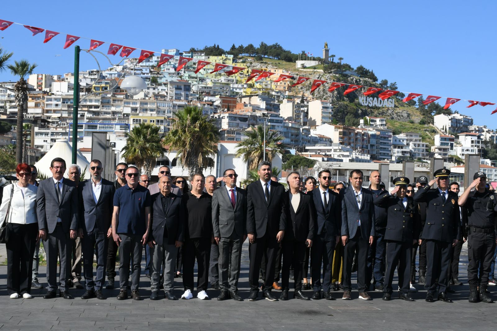 Atatürk Meydanı'nda düzenlenen törene, CHP Kuşadası İlçe Başkanı Mehmet Gürbilek, Kuşadası Belediye Başkan Yardımcısı Özgür Batçıoğlu, Kuşadası İlçe Emniyet Müdürü Mehmet Ali Berksoy, emniyet müdür yardımcıları, şube müdürleri, amirler, sivil toplum kuruluşlarının temsilcileri ve polis memurları katıldı. Törende, İlçe Emniyet Müdürü Mehmet Ali Berksoy tarafından Atatürk büstüne çelenk sunuldu. Saygı duruşunda bulunulması ve İstiklal Marşı'nın okunmasının ardından tören sona erdi.